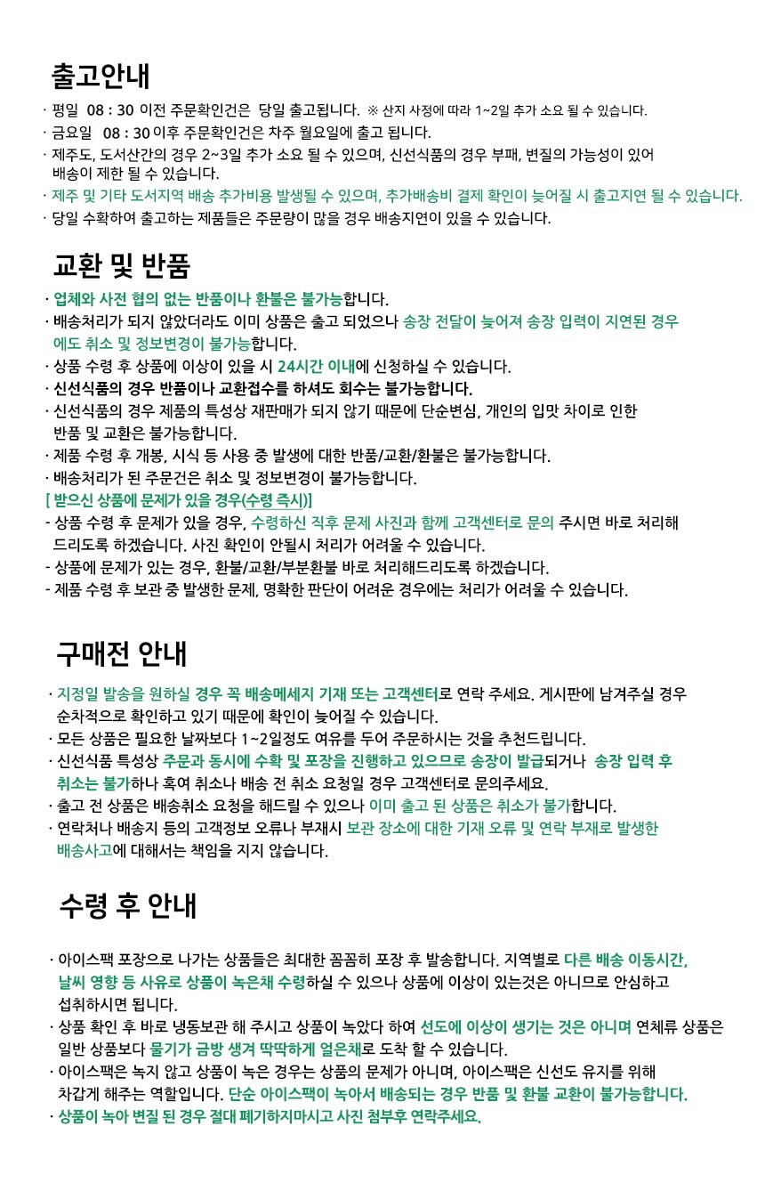 · 배송은 입금확인된 날짜로부터 1~3일 소요되며 최대 7일 이내 출고됩니다. ( 공휴일, 기상악화 등 불가피한 상황에 따라 추가 지연될 수 있습니다.)